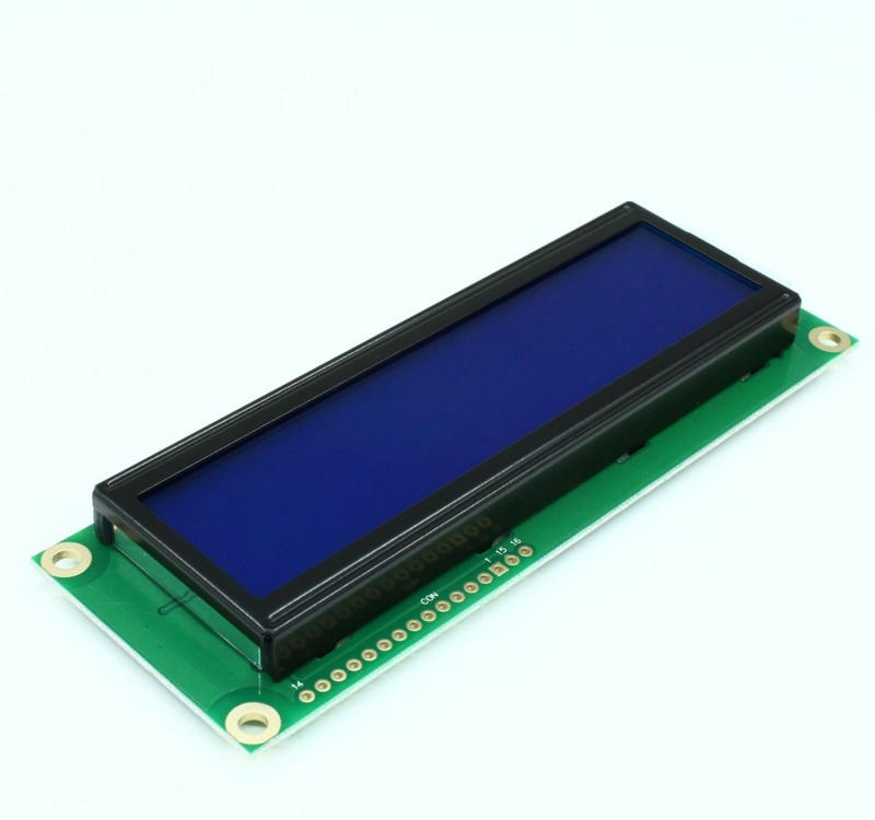 ЖКИ знакосинтезирующий 16 x 2, STN Синий Негативный/прозрачный светодиодная подсветка белая, размеры 122×44 мм, видимая область 99×24 мм, -20…70°C, контактные площадки снизу 16 выводов